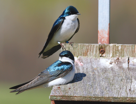 Larger broods bring more stress for a tree swallow mom (below, with mate), but also more fledglings. See “Stressed bird moms.”