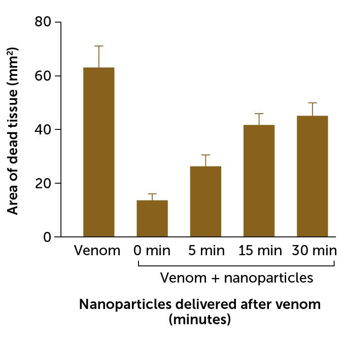 When tested in mice, synthetic nanoparticle antibodies prevented skin tissue death caused by black-necked spitting cobra venom. The nanoparticles were most effective when injected into the wound right after the venom was injected (0 min); the longer the wait, the larger the wound.