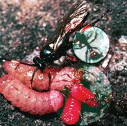 HIDE AND SNEAK. Top: A wasp will inject its eggs into a rare butterfly’s caterpillars hiding deep in nests of ants (highlighted).