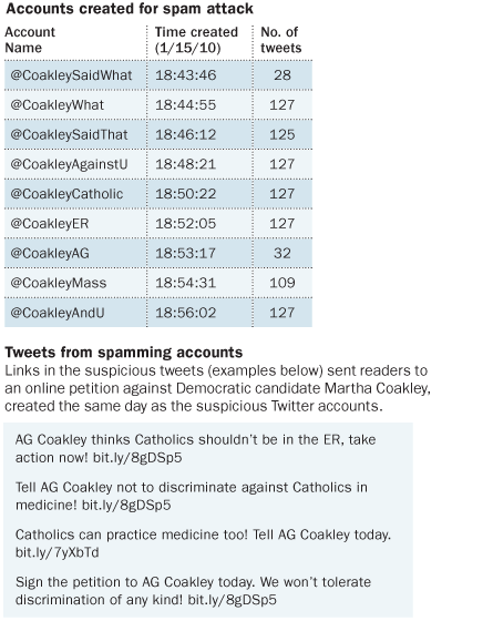 Using Twitter’s application programming interface, which allows researchers to collect and examine tweets, Mustafaraj and Metaxas hunted for news about the special election. In the days surrounding the election, they collected more than 234,697 tweets that contained the words “Coakley” or “Scott Brown.” Among tweets containing links to websites, a disproportionate number directed readers to “coakleysaidit.com.” This website, which appeared in 1,112 tweets, urged people to sign an online petition protesting Coakley’s “discrimination” against various groups.