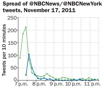 Misinformation can spread quickly through social media, but corrections may not travel as far or fast. Last November, two days after Occupy Wall Street protesters were evicted from Zucotti Park in New York City, the local NBC station sent out a tweet that the New York Police Department was closing air space above the protests, a message quickly retweeted by others. A few minutes later, NYPD tweeted that the information was incorrect. While NBC immediately sent out corrections, an analysis by Gilad Lotan of the social analytics company SocialFlow reveals that the correction (blue) wasn’t tweeted as much as the incorrect claim (green).