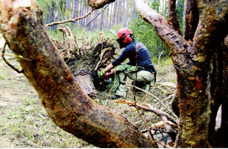 The work, aimed at finding out how best to manage carbon in woodlands, including those at military reservations, is done under contract with the U.S. Department of Defense. The project managers include faculty at Auburn University and the University of Florida. Sometimes, the tools are those of timber cutters and construction workers: chain saws, backhoes and mattocks swung with a lot of sweat in the hot sun. Among the stranger devices is the air spade. It is a jackhammer with no jack but, rather, a stiff stream of compressed air to blow soil off roots as they are dug. “It’ll take me and a crew of eight men all day to get one tree out,” Johnsen says. The team digs down for only a few feet around most of a tree, but excavates six feet or more straight under to get the bulky, often forked taproots.