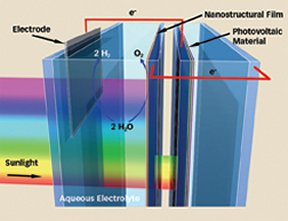 When exposed to sunlight, the nanostructured film absorbs UV and blue light. The rest of the spectrum passes through the material to be absorbed by the Grätzel cell. That solar cell provides extra electrons that make the water splitting more efficient.