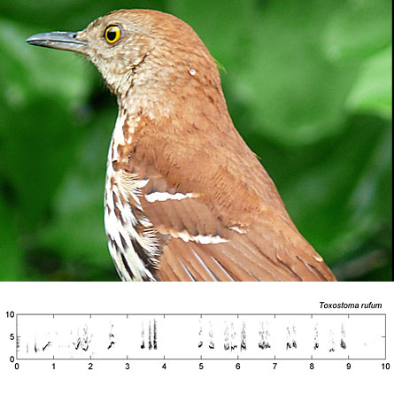 VIRTUOSO The brown thrasher belongs among the most elaborate of singers in the mockingbird family. The differing shapes in the spectrogram representing song (below) show the variety of sounds in just 10 seconds of a male’s song.