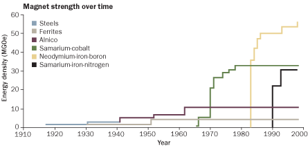 Adding neodymium atoms smothers some of the iron’s magnetic strength but greatly improves its ability to resist demagnetization. Neodymium magnets can achieve about 56 megagauss-oersteds, or MGOe, a unit of magnetic field strength. That compares with more than 10 MGOe for the best non–rare earth magnets, and less than 5 MGOe for the stuff used in refrigerator magnets.