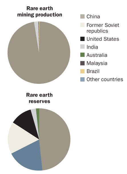 But some people, particularly in the United States and Japan, have begun to worry about potential shortages in the supply of rare earths. Although the elements are not rare in themselves, they are concentrated in just a few locations. Last year, China produced about 97 percent of the rare earths mined on the planet. In recent years that country has been cutting back on the amount of rare earths it exports, reducing quotas by almost 40 percent in 2010.