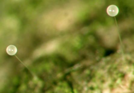 In O. cincta, little brown-and-white males roam the leaf litter making no apparent effort to find a female. Instead, males pause here and there for a few seconds to leave behind white stalks topped by a shiny-coated globes, each holding more than 1,000 sperm.