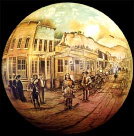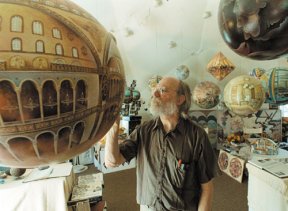 Math Trek Math Sphere Worlds By Ivars Peterson December 17, 2004 at 4:07 pm - More than 2 years ago Share this:Share Share via email (Opens in new window) Email Click to share on Facebook (Opens in new window) Facebook Click to share on Reddit (Opens in new window) Reddit Click to share on X (Opens in new window) X Click to print (Opens in new window) Print The world of artist Dick Termes is a world of spheres—big spheres, little spheres, transparent spheres, and, most of all, painted spheres. Dick Termes with some of his painted spheres. Courtesy of Dick Termes Courtesy of Dick Termes “There is beauty in just pure geometry,” Termes says. Courtesy of Dick Termes A recently completed termesphere provides an all-encompassing glimpse of the town of Deadwood in its early days.