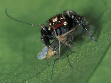 Engorged-mosquito breath proves attractive to both males and females among Evarcha culicivora jumping spiders, says spider biologist Fiona Cross of the University of Canterbury in Christchurch, New Zealand. She and her colleagues tested the preferences of both spider sexes by timing how long they lingered in a stream of air wafting over potential mates that had different dining histories.