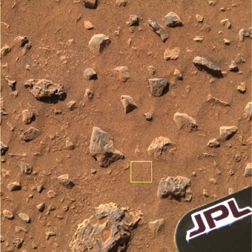 Spirit drove less than 3 meters from the lander before examining its first target, a pebbly patch of Martian soil. Extending its tool-laden arm, the rover used an image-taking microscope to record the fine-grained texture of the patch.