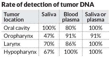 In the new study, saliva samples revealed such tumor DNA in 100 percent of tested patients with oral cavity cancer. Plasma samples picked up tumor DNA in 86 to 100 percent of patients with cancers lower in the throat and neck. Testing both plasma and saliva revealed tumor DNA in 96 percent of patients studied.