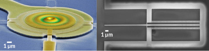 Physicists have entangled the motions of pairs of wiggling structures. Seen in these electron microscope images are the different types of devices that two teams used: vibrating drumheadlike objects (one at left) and expanding and contracting silicon beams (similar to that shown at right).