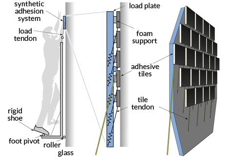 Hawkes can work his way up a glass wall using a climbing device based on arrays of sticky tiles, each rigged with a spring made of the nickel-titanium alloy nitinol.
