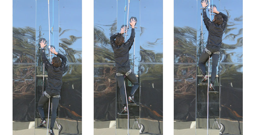 WALL WALKER Stanford researcher Elliot W. Hawkes, at 70 kilograms, scales a 3.6-meter-high glass wall with gecko-inspired adhesive pads rigged with special stretchy tendons.