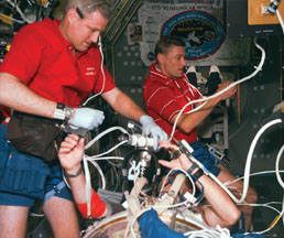 One finding was that astronauts lose 10 to 20 percent of their blood volume during space flight. The most probable explanation, say the researchers, is that the fluid in the blood slips out of the circulatory system into tissues–causing puffiness and swelling but less blood volume–or that the excess fluid in the astronauts’ upper body signals the kidneys to excrete fluid as urine. In either case, blood that normally would flow to and from the extremities lingers in the body’s core.
