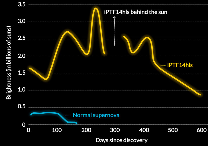 The first sign that iPTF14hls was unusual came a few weeks after its discovery, when it started growing brighter. That turned out to be one of five irregular cycles of brightening and dimming.