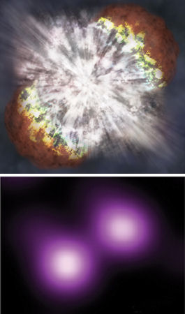 The teams led by Smith and Ofek propose that SN 2006gy marks the death of a star that was between 150 and 240 times as heavy as the sun. In such a star, energetic gamma rays push out from the core and resist gravity’s pull. Instability sets in when gamma rays annihilate each other and become pairs of electrons and positrons. As the rays vanish, the entire star collapses and then blows up, leaving behind no black hole or neutron star. This type of explosion, known as a pair-instability supernova, can produce an outburst as bright as SN 2006gy, the two teams suggest.