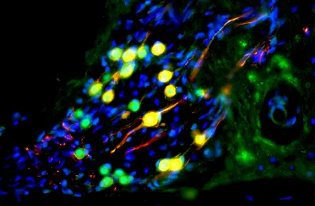 A new technique that grows sound-detecting nerve cells (yellow) from embryonic stem cells (green) in the cochleas of deaf gerbils may be helpful in restoring hearing.