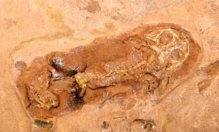 Recently, however, Anderson and his colleagues unearthed Gerobatrachus hottoni, a species whose genus name means “elder frog.” The single specimen unearthed so far is about 11 centimeters long, the size of most modern-day salamanders. It was found in a two-foot-thick knob of 290-million-year-old, fine-grained siltstone in north-central Texas. Even though the fossil was found in rocks deposited just before the start of the lengthy gap in the fossil record, the remains have features characteristic of the frogs and salamanders that presumably descended from it or others like it, Anderson says.