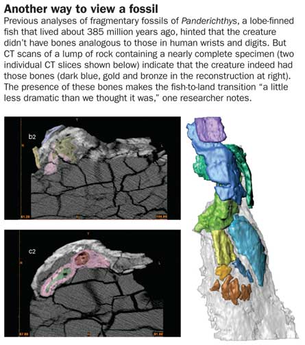 However, new analyses of a near-complete specimen of Panderichthys — specifically, a CT scan of a fossil still partially encased in rock — do in fact suggest that those semiaquatic creatures had such bones after all, Ahlberg and colleagues reported last year in Nature. And recent studies in other fish species such as paddlefish and Australian lungfish suggest that a second wave of HOX gene activity can occur during embryonic development in fish. To create a foot, one of the key features of land vertebrates, Ahlberg notes, “all that evolution did was reshape and repattern a structure that was already there.… It didn’t have to build a novel extension of the body from scratch, so the transition from fish to land vertebrate becomes a little less dramatic than we thought it was.”