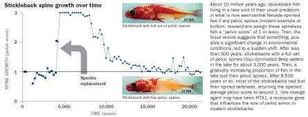 Even before the decline in growth of pelvic spines for the sticklebacks kicked in, however, subtle evolutionary changes were taking place, Bell says. Measurements of the spines indicate that during the 3,000 years when all the sticklebacks retained all of their pelvic spines despite danger from predators, the spines were becoming shorter as generations passed. That trend suggests that anatomical changes were happening via one of the other genes known to have an effect on pelvic spines — or possibly via a different gene yet to be discovered in modern relatives.