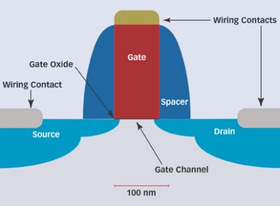 A thin layer of electrically insulating material, usually silicon dioxide with some nitrogen mixed in, coats the channel and is itself topped by a block of metal-enriched silicon called the gate, which supplies the current-controlling electric field. Today, all of these parts occupy an area that would fit easily in a red blood cell.
