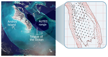Experiments planned by Southall’s team for this summer in the Bahamas are designed to sift through these ideas and get at the peculiar set of circumstances that sends beaked whales to the beach. Using the Navy’s 600-square-mile grid of interconnected, underwater microphones at the Atlantic Undersea Test and EvaluationCenter, researchers will continue playback experiments that began last summer, exposing the animals to low levels of sounds and tracking their responses.
