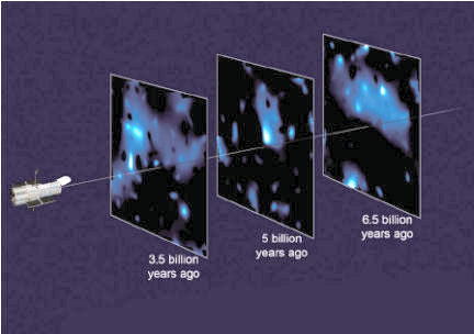 Treating the survey as if it were an archaeological dig, the team divided the observable galaxies into slices from three different cosmic epochs. Gravity-generated distortions in images of the galaxies from each time slice then enabled the researchers to map the distribution of dark matter as it appeared 3.5 billion, 5 billion, and 6.5 billion years ago. The earliest map represents the cosmos at nearly half its current age. The maps demonstrate how dark matter weaves a cosmic web, with filaments growing in size and density as the universe ages, Ellis says.
