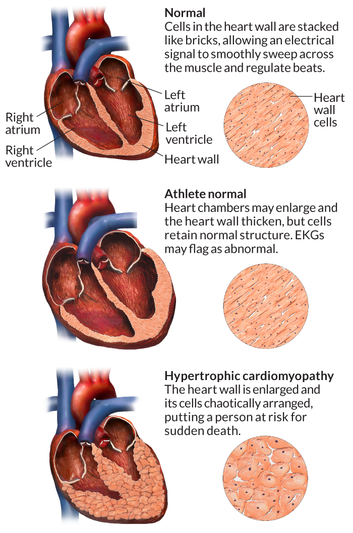 The main problem is that, on the etchings of an EKG, the heart of a conditioned athlete might look too much like a heart with hypertrophic cardiomyopathy, the most common cause of sudden death in young athletes. With this inherited condition, the muscle cells that make up the heart are not stacked into tidy rows as they should be, and the heart walls grow thick and rigid. As a result, the waves of electricity that sweep across the heart to orchestrate rhythmic contractions can become disorderly. Under physical exertion, the heart can be seized by cardiac arrest and stop pumping blood — which is fatal within minutes unless the heart is restarted with a defibrillator.