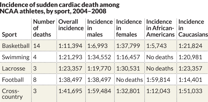 He contends the number is much higher. Estimates tend to rely on counting media reports, he says, since most, like the case of Wes Leonard, generate news stories. They don’t all, however, and he says even death certifications can be unreliable. In 2011 in Circulation, Drezner and his colleagues published a study that scoured not only the media, but insurance databases and records at the National Collegiate Athletic Association from 2004 to 2008. He found 45 deaths from cardiovascular disease among athletes during that time, which, given the number of college athletes, would put the death rate from sudden cardiac death far above previous estimates, at about 1 in 44,000 per year among NCAA athletes. For reasons not understood, male basketball appeared to have the highest death rate, at 1 in 7,000 players — far from the often-cited 1 in 200,000 number.