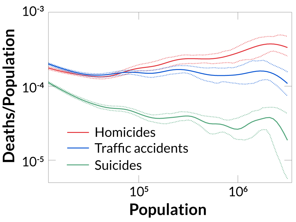 As expected, big cities had higher homicide rates than smaller ones. And though the number of traffic deaths doubled when city populations did, the number of suicides increased by only about 78 percent.