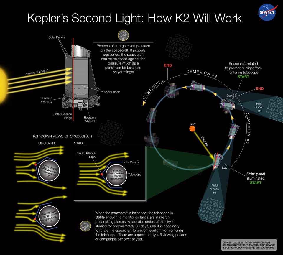 Shortly after the first wheel failed in 2012, says Steve Howell, project scientist for the Kepler mission, engineers at Ball Aerospace came up with an ingenious solution for continuing on two wheels: Use sunlight to balance the telescope.