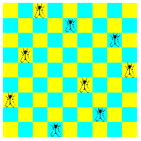 Nine flies are sitting on a checkered tablecloth. They happened to have arranged themselves so that no two flies are in the same row, column, or diagonal.