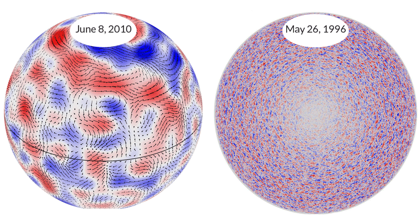 GO WITH THE FLOW Long-lasting plasma flows appear in red and blue in this animation, which portrays data from four solar rotations. Some flows persist for several months; these patterns are especially visible near the sun’s north pole. Scientists think these flows keep the sun’s equator rotating faster than its poles.
