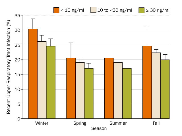 In every season, people in the lowest vitamin D group were about 36 percent more likely to be suffering a respiratory infection than those in the highest group. Infection risks for people in the middle group fell between those rates.