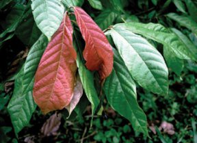 RED START. In sun, young cacao leaves begin crimson but later turn green and pick up fungi.