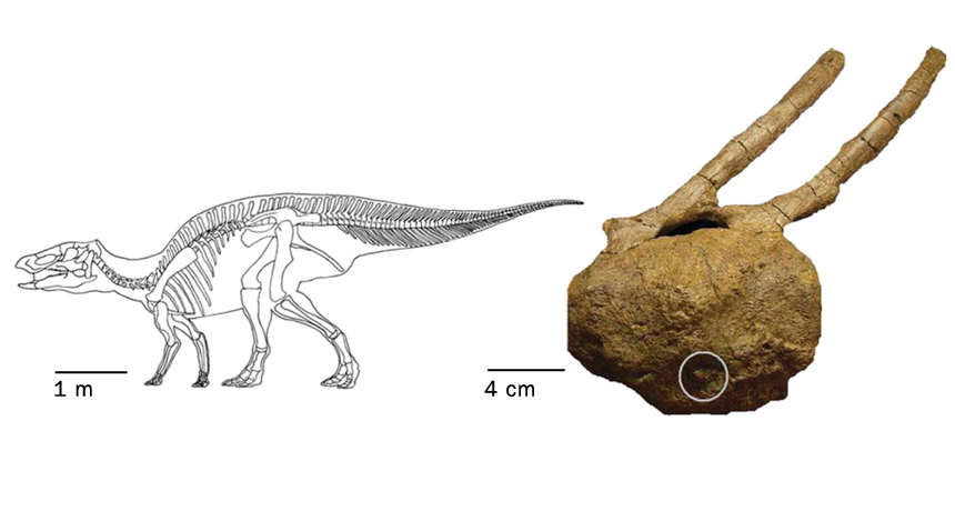 In a healed wound in the tailbone fossil of a duck-billed dinosaur (left, site of wound in red), researchers found a Tyrannosaurus rex tooth crown lodged in a pair of fused bones (right, circle denotes location of the tooth). This discovery is direct evidence that T. rex hunted.