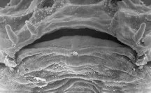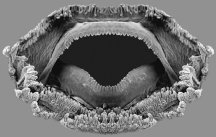The jaws work in an unusual style, too. The lower one has an extra hinge, so the tadpole can open its mouth to a superwide gape.