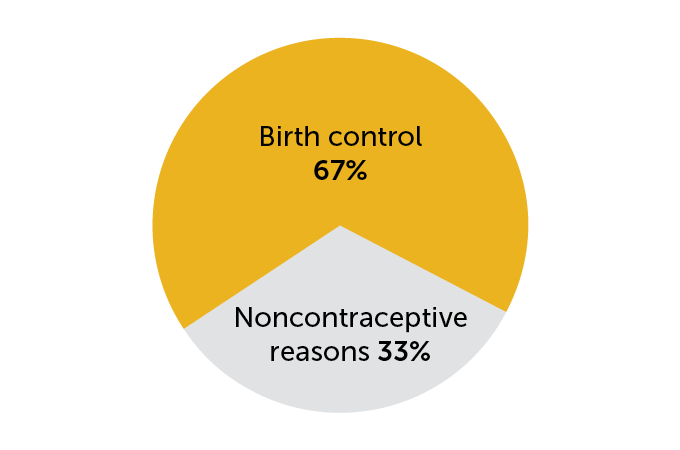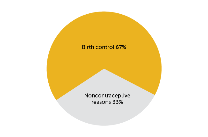 About two-thirds of 15–19-year-olds report using the pill for contraception, a 2011 analysis shows. A third report using the method solely for noncontraceptive purposes, such as reducing menstrual pain, regulating periods or treating acne or endometriosis.