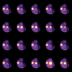 Sweeping beams of radiation from rapidly spinning stars called pulsars vary in intensity. No one knows why. Simultaneous recordings of the Crab pulsar’s visible light, shown in these images to the right of another star, and its radio emissions may demystify the phenomenon. When read left to right and top to bottom, the images show the pulsar reaching peak brightness toward the end of its 33-millisecond rotation.
