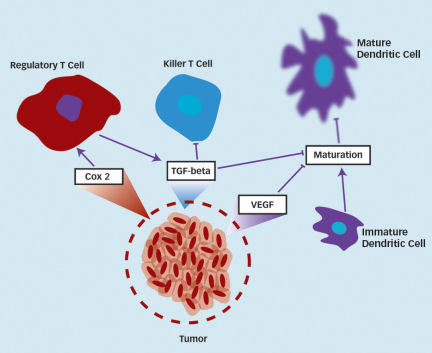 For example, cancer cells emit a protein called vascular endothelial growth factor (VEGF), which triggers the creation of new blood vessels to feed the fast-growing tumor. Conveniently for the tumor, VEGF also stifles the maturation of dendritic cells. Keeping dendritic cells stuck in an immature state prevents them from performing their critical role of training and activating killer Ts. What’s more, these immature dendritic cells actually stimulate T-regs, which suppress the immune response even further. Dendritic-cell development is also hindered by other tumor compounds, including the immune-signaling molecules interleukin 6 and 10, a substance called transforming growth factor—beta, and the inflammation-related enzyme cyclooxygenase-2.