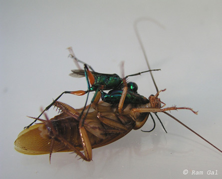 BRAIN SHOT A wasp downs a cockroach with a double sting, one temporarily paralyzing it and the second delivering a venom to the brain that weakens the roach’s drive to walk.