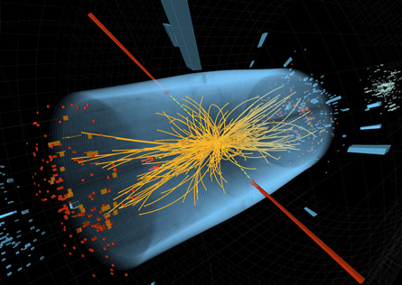 HIGGS IN THE SPOTLIGHT Colliding protons create a splash of particles streaking outward along paths (yellow) reconstructed here from data collected by the CMS detector at CERN’s Large Hadron Collider.
