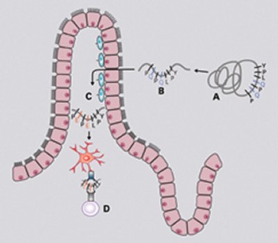 CELIAC LINKS. Digestion breaks down gluten (A) into peptides (B) that are absorbed by the small intestine. There, the enzyme tissue transglutaminase (C) modifies certain peptides, which are picked up by dendritic cells and, in people with celiac disease, stimulate immune cells (D) to attack the intestine.