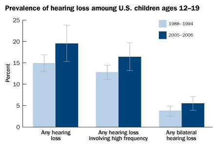 But in the August 18 Journal of the American Medical Association, the scientists report that the portion of U.S. adolescents aged 12 to 19 with any hearing loss rose from 14.9 percent during the 1988 to 1995 period to 19.5 percent in 2005 and 2006.