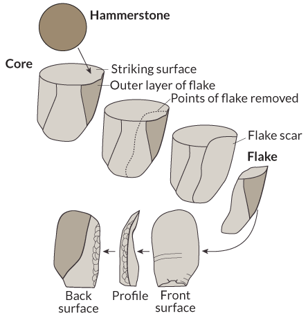 Shea also gives the boot to the oldest tool industry, the 2.6-million-year-old Oldowan. And he shoots down the Acheulean industry, best known for teardrop-shaped stone hand axes dating to as early as 1.7 million years ago. In a college textbook to be published in 2016, he suggests a new system based on identifying core toolmaking techniques rather than looking for similarities in artifacts’ shapes or reconstructing steps presumed to have been needed to make tools. Stone tool use, he proposes, developed from 2.6 million years ago onward based on nine ways in which rock can be fractured and ground into tools. One example consists of cores and flakes that have been placed on hard surfaces and pounded with another stone to detach smaller pieces of rock.