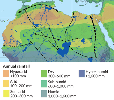 Various H. sapiens populations moved east across North Africa and into the Arabian Peninsula between 130,000 and 75,000 years ago, says archaeologist Eleanor Scerri of the University of Bordeaux in France. After analyzing ancient temperature and rainfall data, she and her colleagues found that four east-west corridors containing lakes and vegetation ran through North Africa’s vast Sahara Desert at that time.