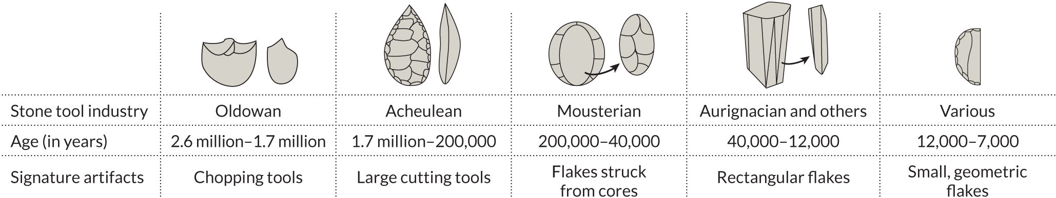 John Shea’s approach to studying stone tools focuses on technique. Categories are based on nine toolmaking operations. Three are shown below. This proposed approach would replace the longstanding practice of sorting finds into stone tool industries.