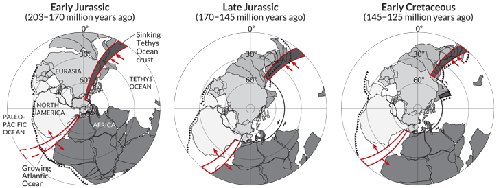 Keppie proposes that the Tethys didn’t just accommodate Pangaea’s breakup — it was the driving force behind the supercontinent’s fragmentation. As gravity pulled the Tethys crust down into the subduction zone, the crust yanked on Pangaea’s Eurasian edge. If strong enough, this tug could have ripped the continent apart between Africa and North America, a weak point left over from where two earlier landmasses had stitched together to form Pangaea.