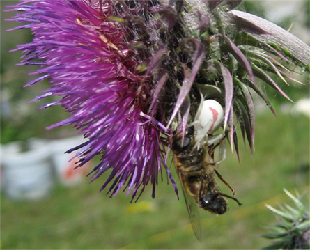 MISMATCH A Misumena vatia spider doesn’t at all match her flower but even this fashion disaster doesn’t keep her from catching as much prey as color-coordinated females. Here she has ambushed a syrphid fly.